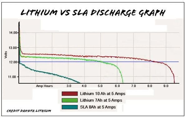 - تحتوي بطاريات الرصاص الحمضية الصغيرة المختومة على انخفاض شديد في الجهد تحت الحمل الثقيل. لم يتم تصميمها أبدًا لتطبيقات التيار العالي. في الواقع ، تم تصميم بطاريات الرصاص الحمضية الصغيرة المختومة بحيث يكون لها حمل صغير عليها على مدى فترة زمنية طويلة. باستخدام 15 إلى 20 أمبير النموذجية من راديو حديث 100 واط ، نشهد انخفاضًا كبيرًا في الجهد. لا تُظهر حزمة أيون الليثيوم أو فوسفات حديد الليثيوم المبنية بشكل صحيح نفس انخفاض الجهد مثل بطارية حمض الرصاص. في الواقع تحت الحمل ، يكون الجهد مسطحًا نسبيًا أثناء تفريغ عبوات فوسفات الليثيوم وحديد الليثيوم.