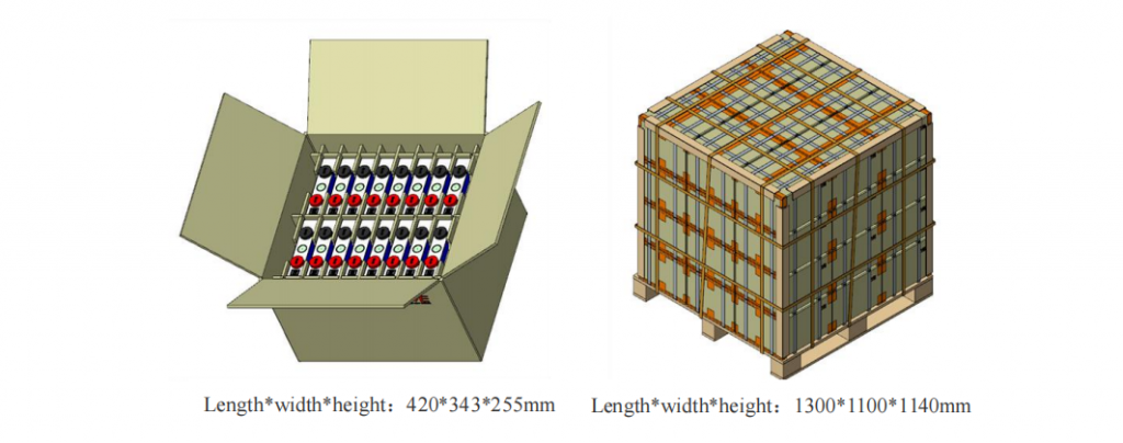 The cells should be packed into boxes under the charge of 30% ~ 50%SOC. During the transportation, they should be protected from severe vibration, shock , extrusion, sun or rain.