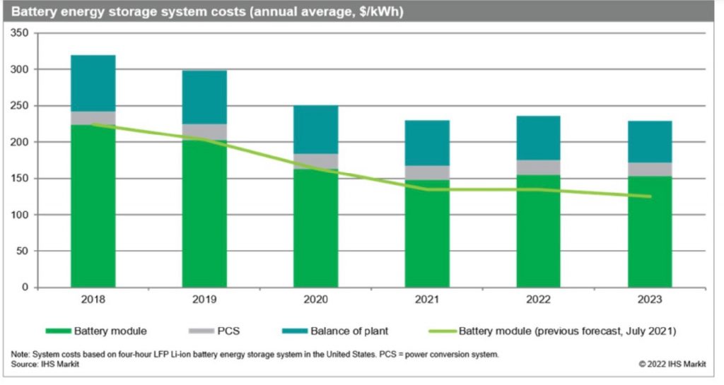 في ورقة بيضاء حديثة ، توقعت IHS Markit أن ارتفاع أسعار المواد الخام من شأنه أن يوقف المزيد من الانخفاضات في أسعار بطاريات المركبات الكهربائية حتى عام 2024. وتوقع هذا التحليل أن يكون متوسط أسعار بطارية 2022 EV أعلى بنسبة 5 ٪ مما كانت عليه في عام 2021 ، ويرجع ذلك في الغالب إلى زيادة السيارات- طلب الصناعة على بطاريات فوسفات الحديد الليثيوم (LFP).